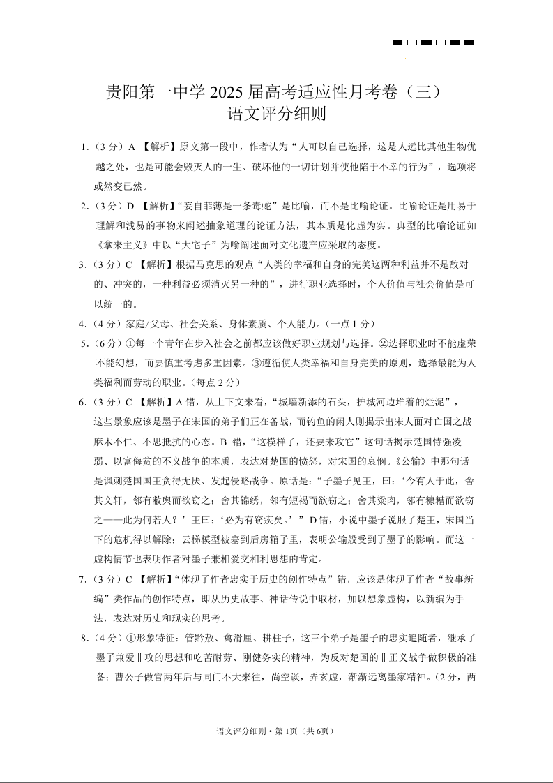 贵州省贵阳市第一中学2025届高三上学期高考适应性月考卷(三)语文答案