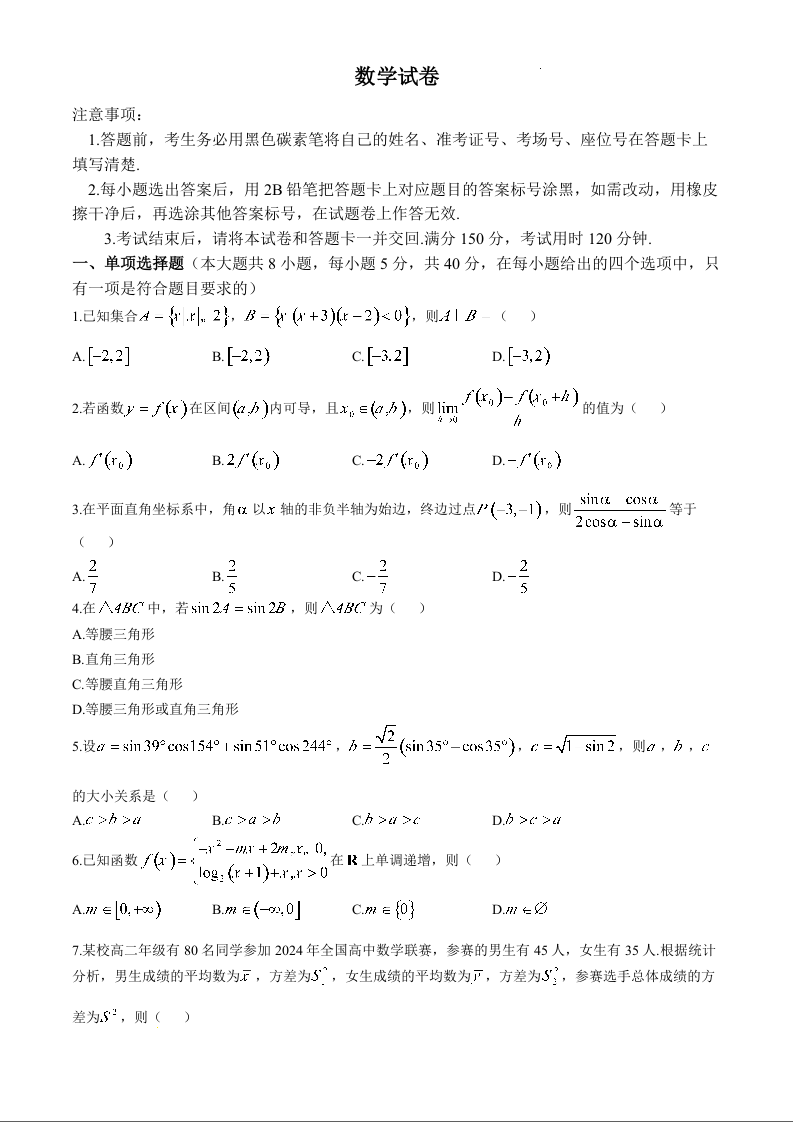 贵州省贵阳市第一中学2025届高三上学期高考适应性月考卷(三)数学+答案