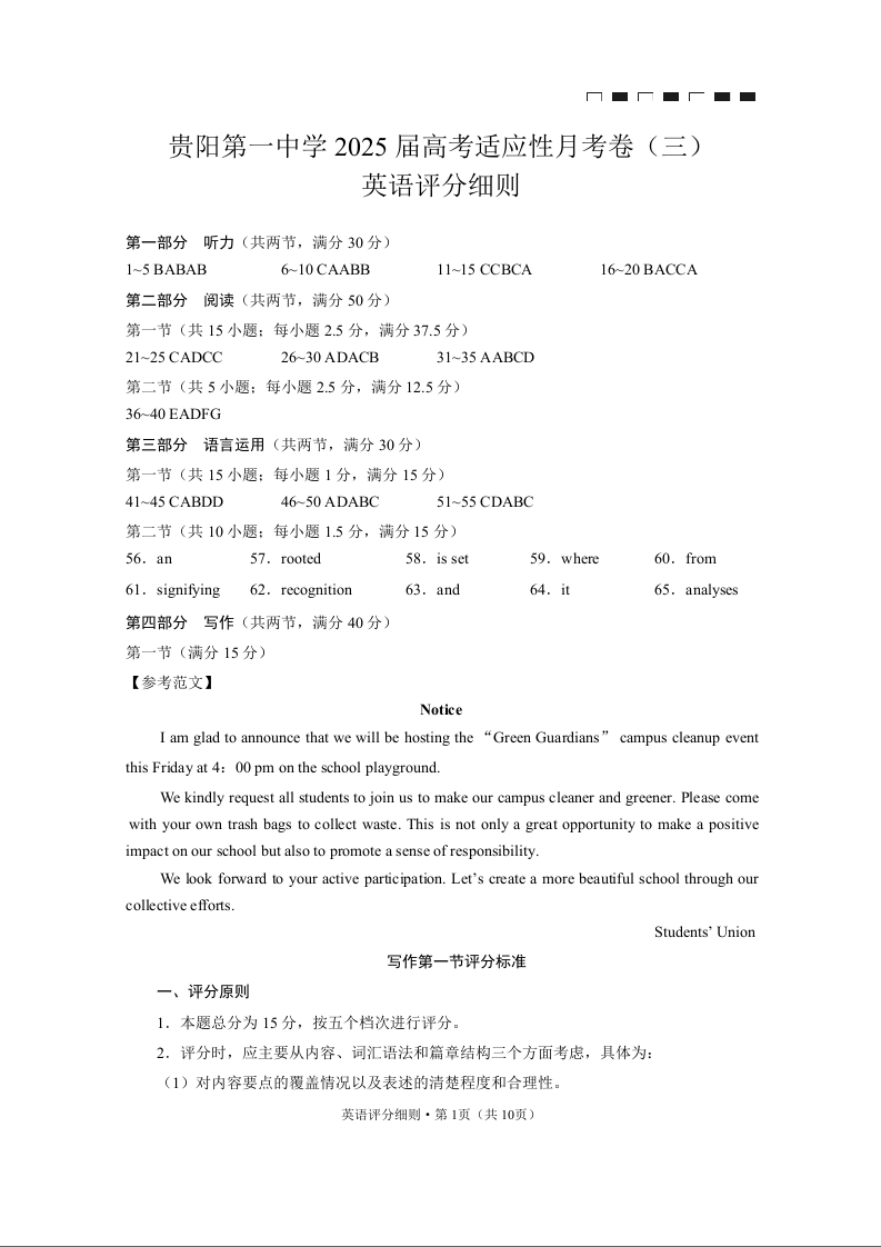 贵州省贵阳市第一中学2025届高三上学期高考适应性月考卷(三)英语答案
