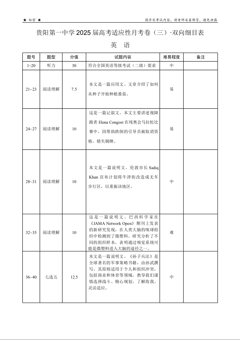 贵州省贵阳市第一中学2025届高三上学期高考适应性月考卷(三)英语•双向细目表