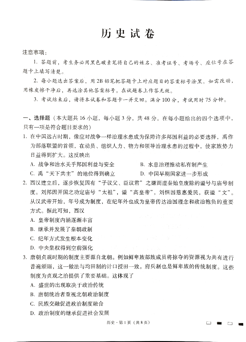 贵州省贵阳市第一中学2025届高三上学期高考适应性月考卷(三)历史