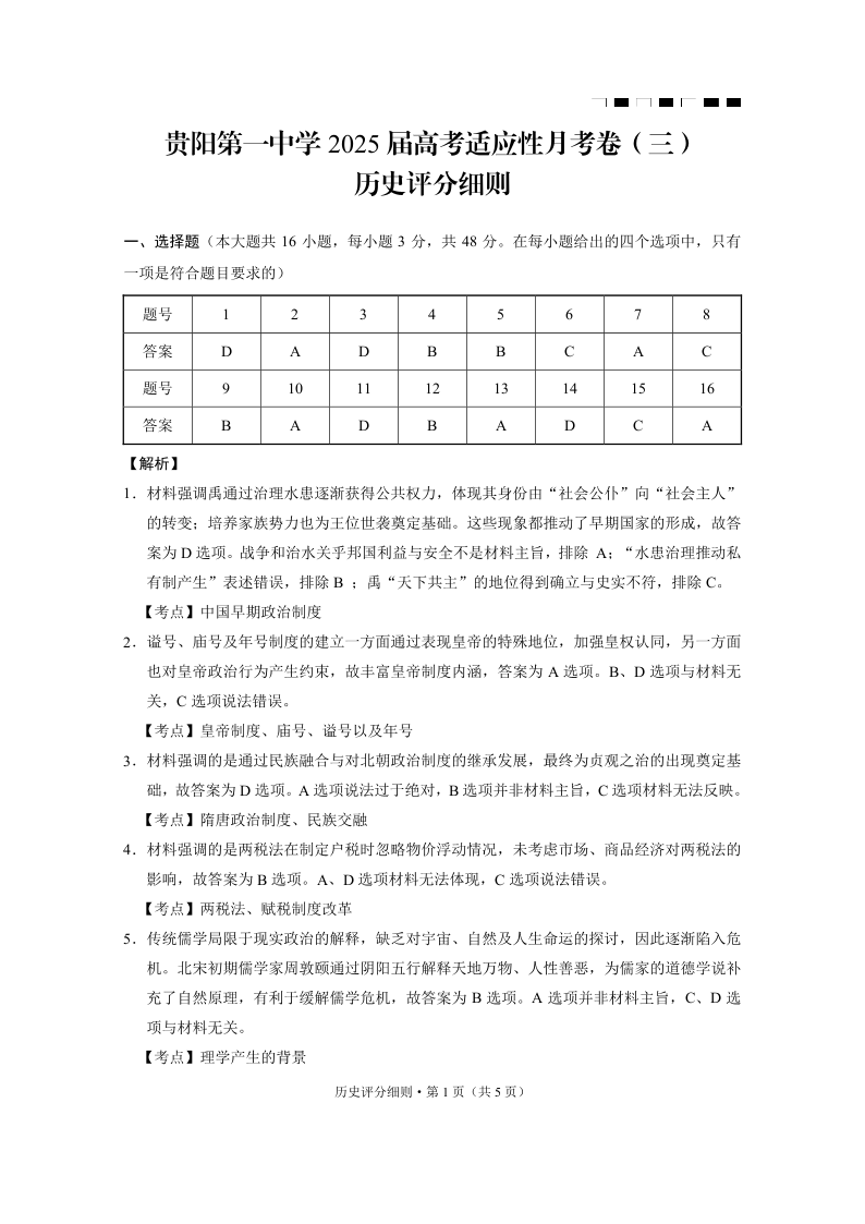 贵州省贵阳市第一中学2025届高三上学期高考适应性月考卷(三)历史答案