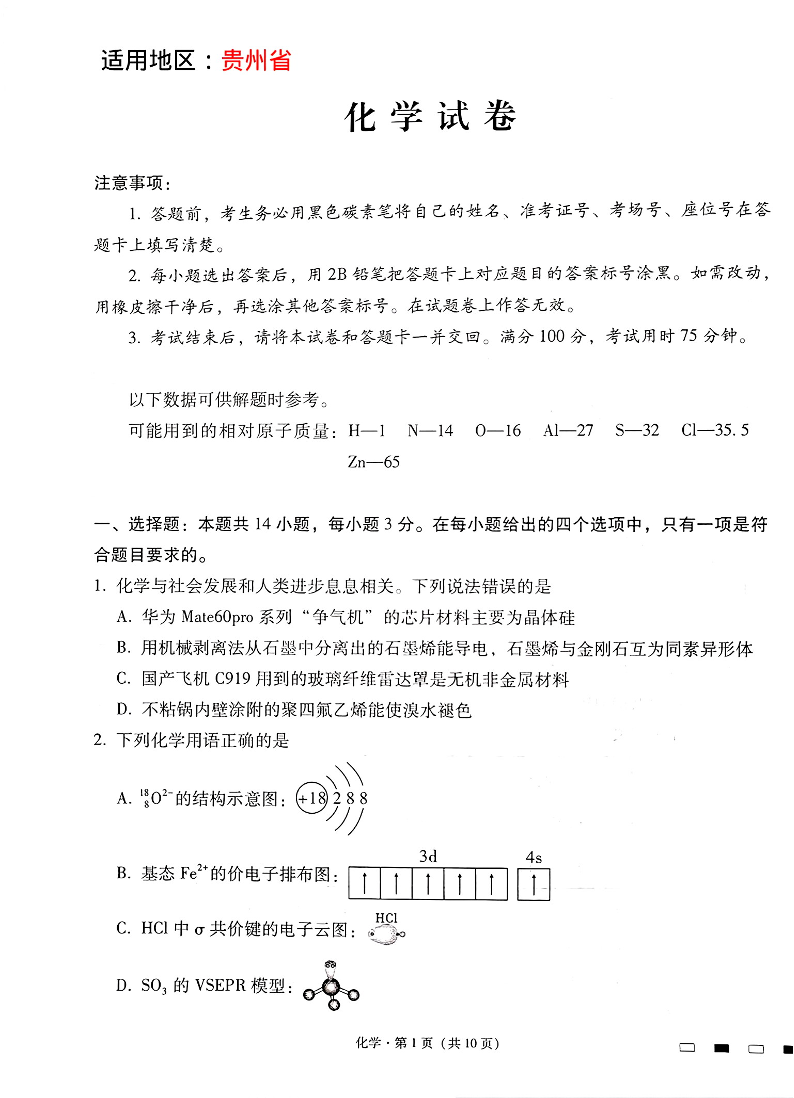 贵州省贵阳市第一中学2025届高三上学期高考适应性月考卷(三)化学+答案