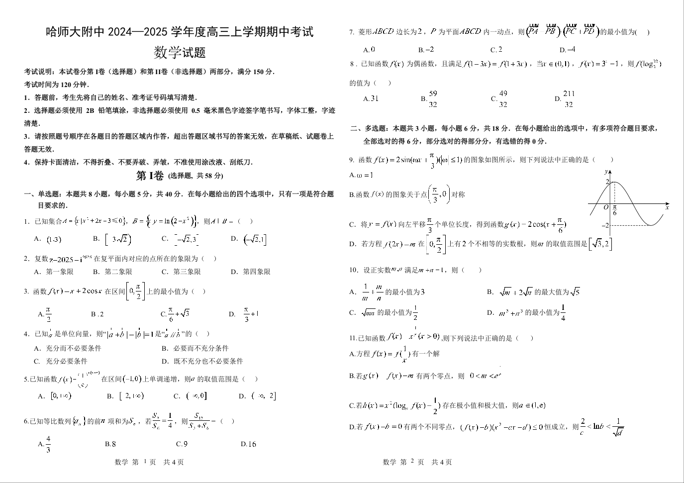 黑龙江省哈尔滨师范大学附属中学2025届高三上学期期中考试数学