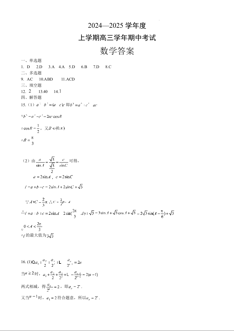 黑龙江省哈尔滨师范大学附属中学2025届高三上学期期中考试数学答案