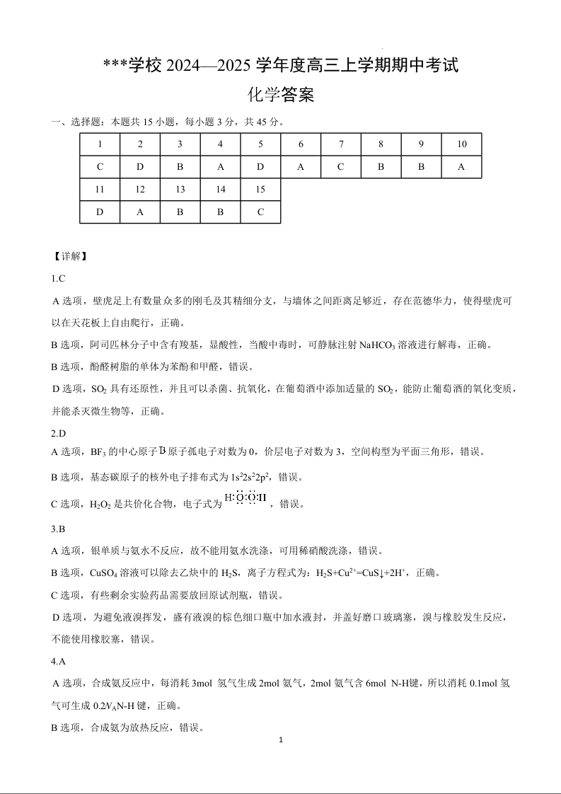 黑龙江省哈尔滨师范大学附属中学2025届高三上学期期中考试化学答案