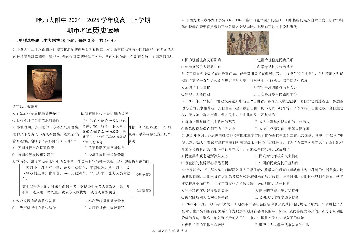 黑龙江省哈尔滨师范大学附属中学2025届高三上学期期中考试历史