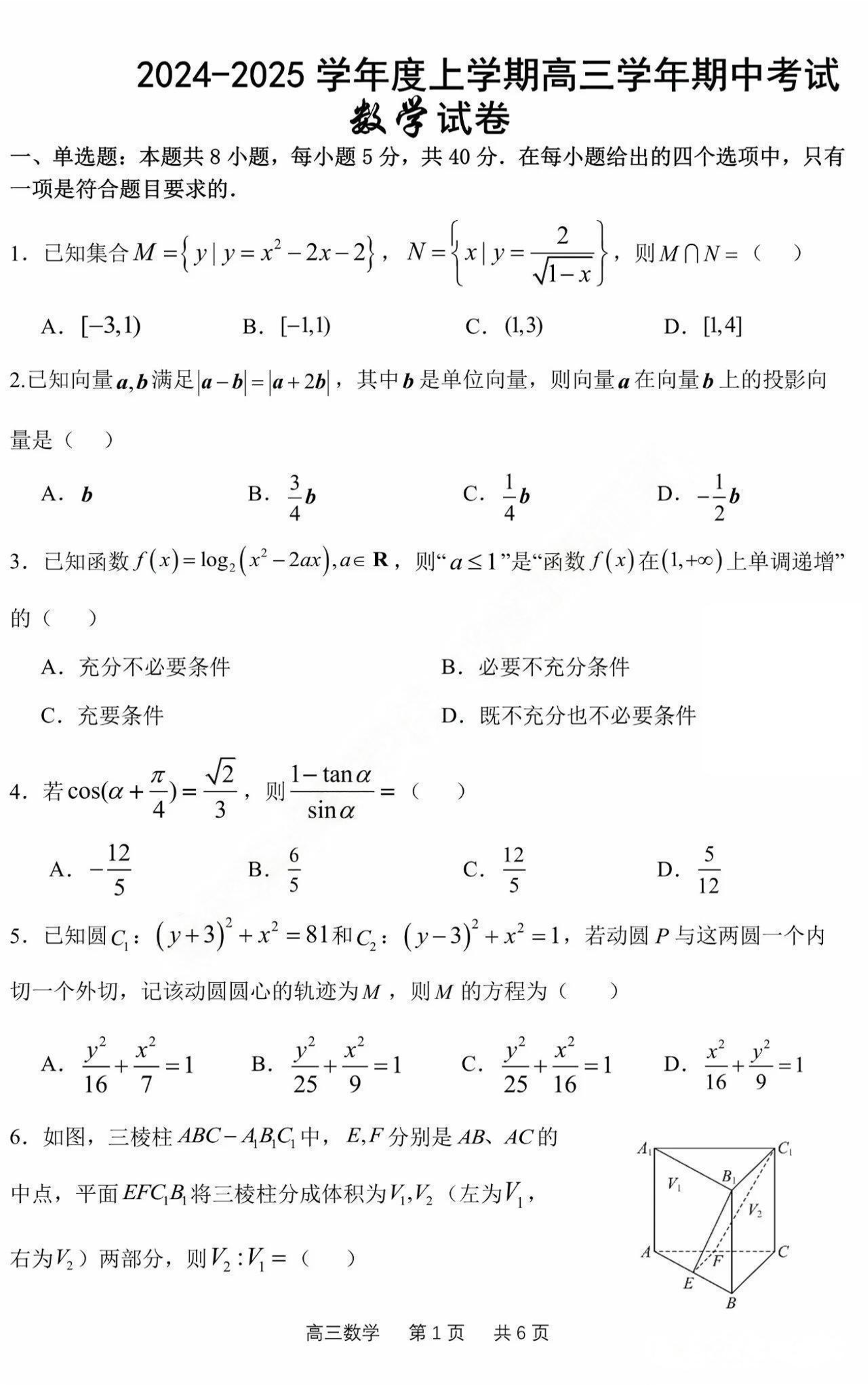 黑龙江省哈尔滨市第三中学2025届高三上学期期中考试数学+答案