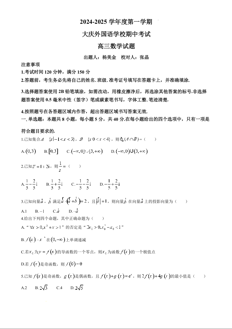 黑龙江省大庆外国语学校2025届高三上学期期中考试数学+答案