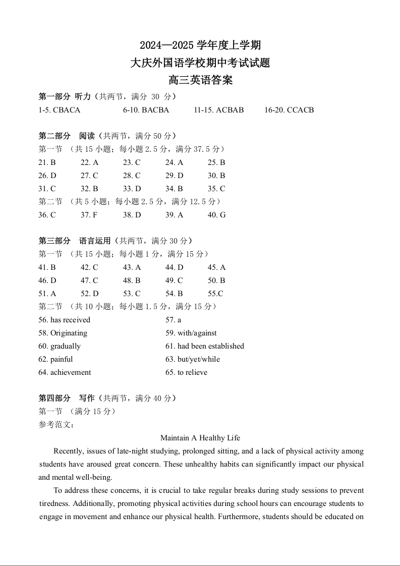 黑龙江省大庆外国语学校2025届高三上学期期中考试英语答案