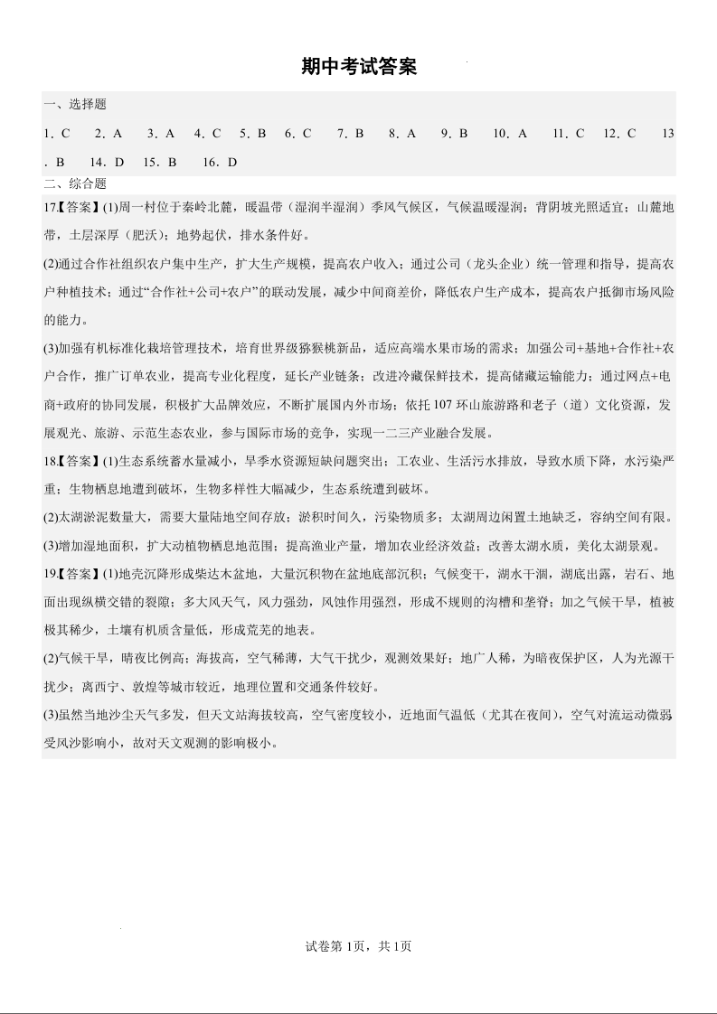 黑龙江省大庆外国语学校2025届高三上学期期中考试地理答案
