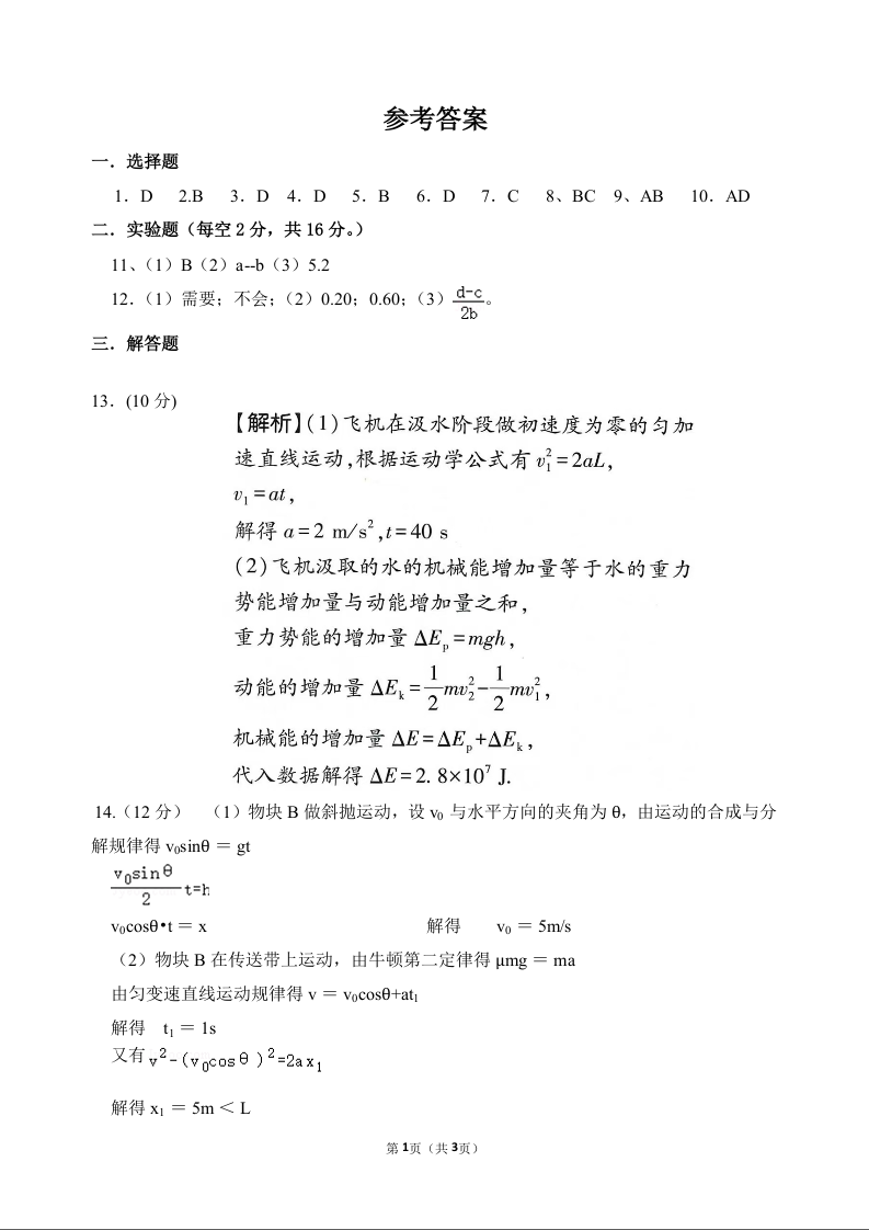 黑龙江省大庆外国语学校2025届高三上学期期中考试物理答案