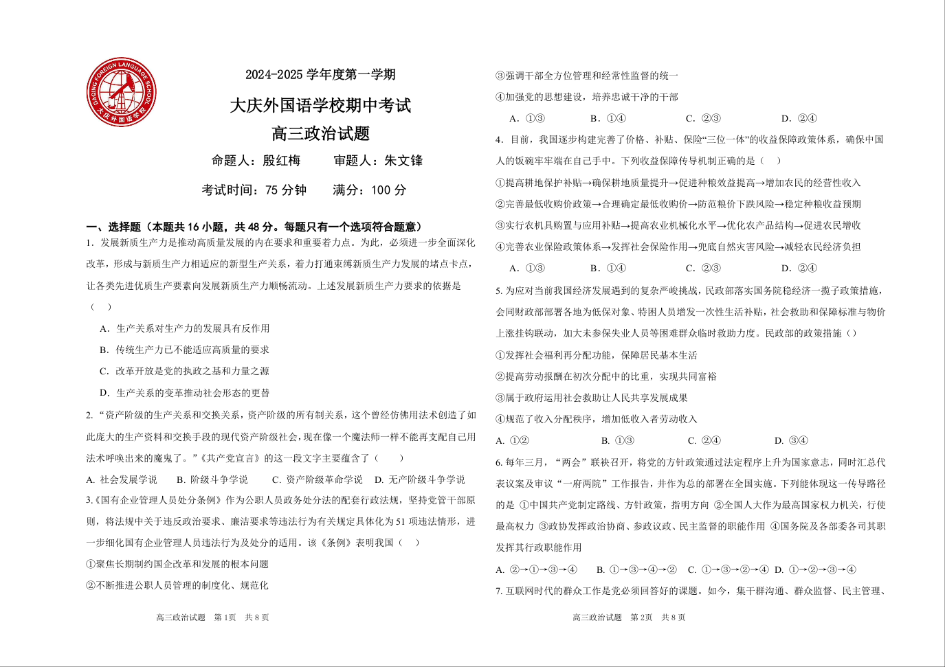 黑龙江省大庆外国语学校2025届高三上学期期中考试政治