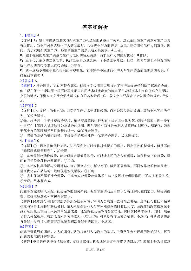 黑龙江省大庆外国语学校2025届高三上学期期中考试政治答案