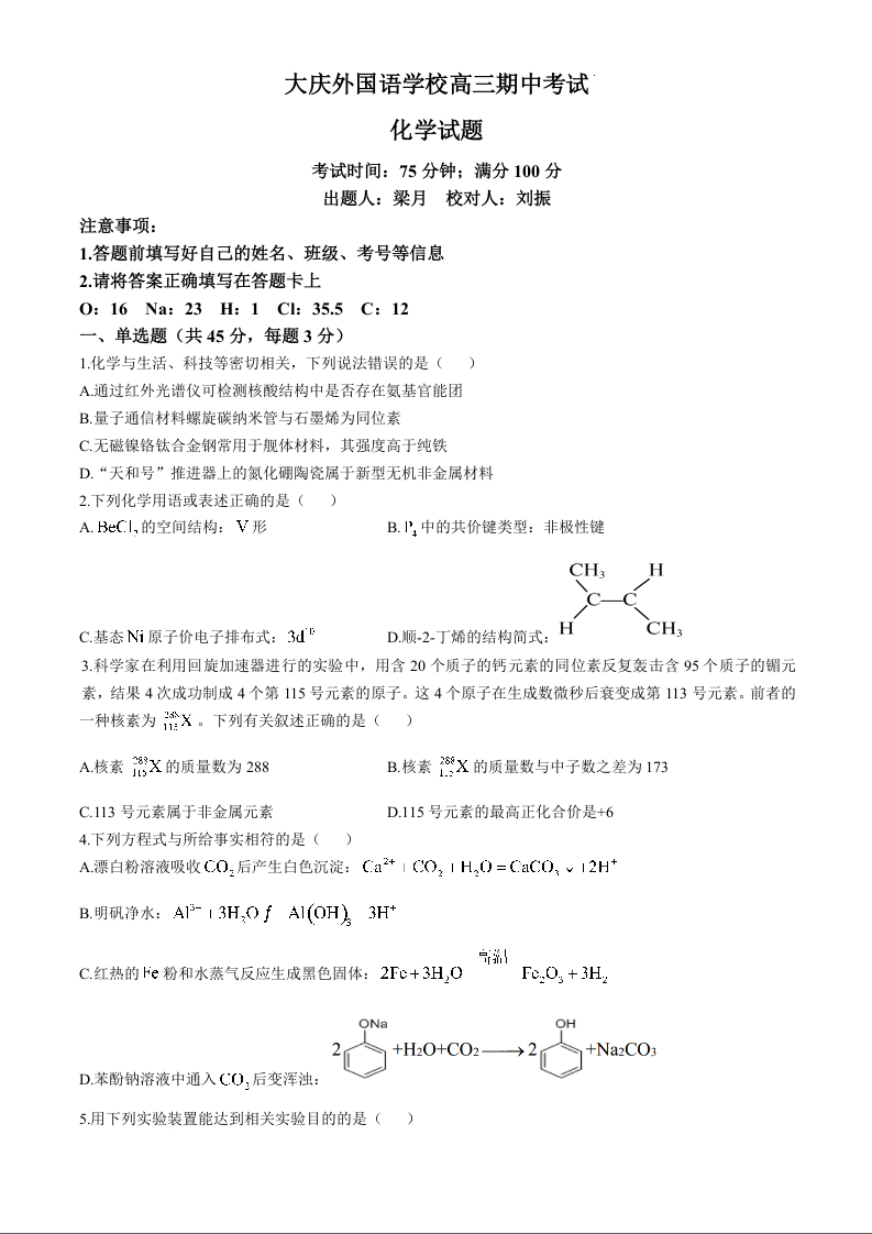黑龙江省大庆外国语学校2025届高三上学期期中考试化学+答案