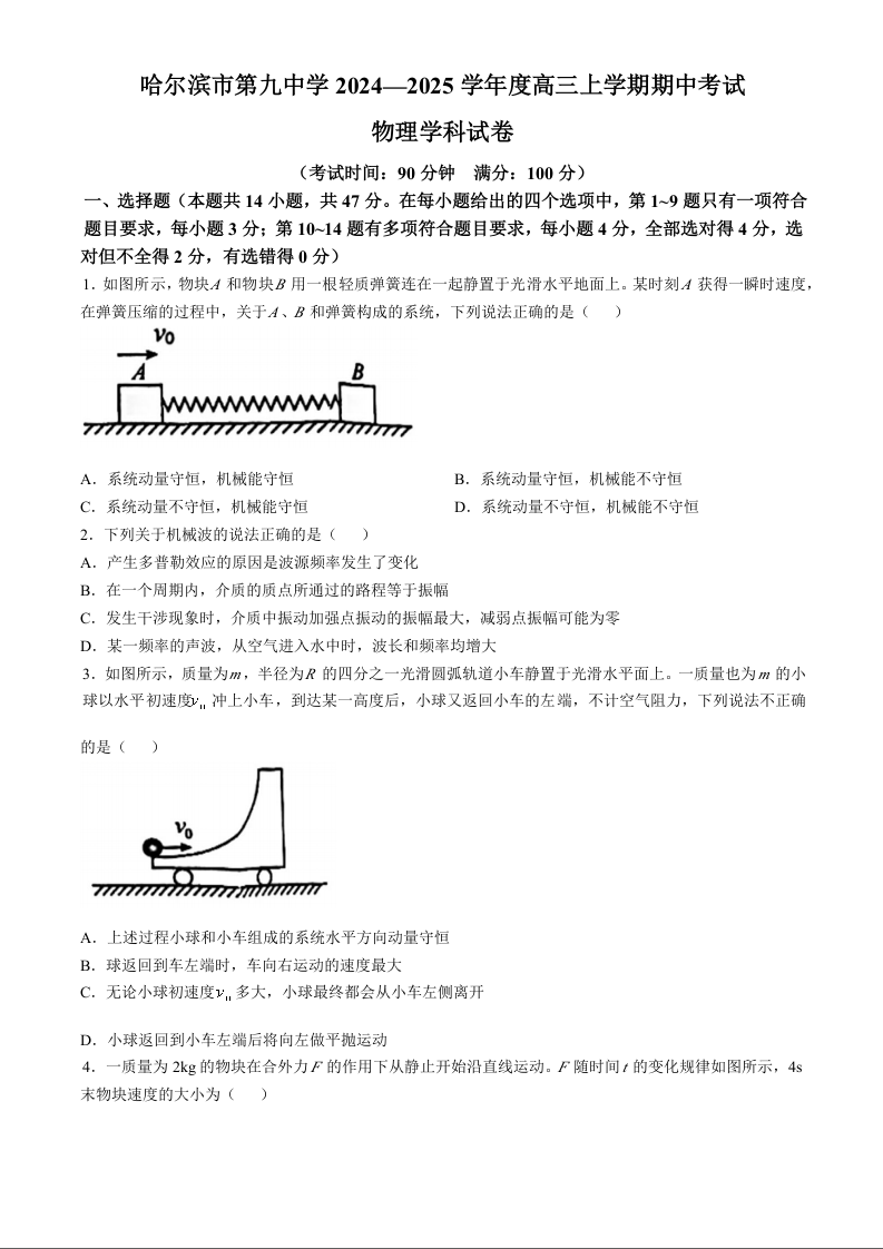 黑龙江省哈尔滨市第九中学2025届高三上学期期中考试物理