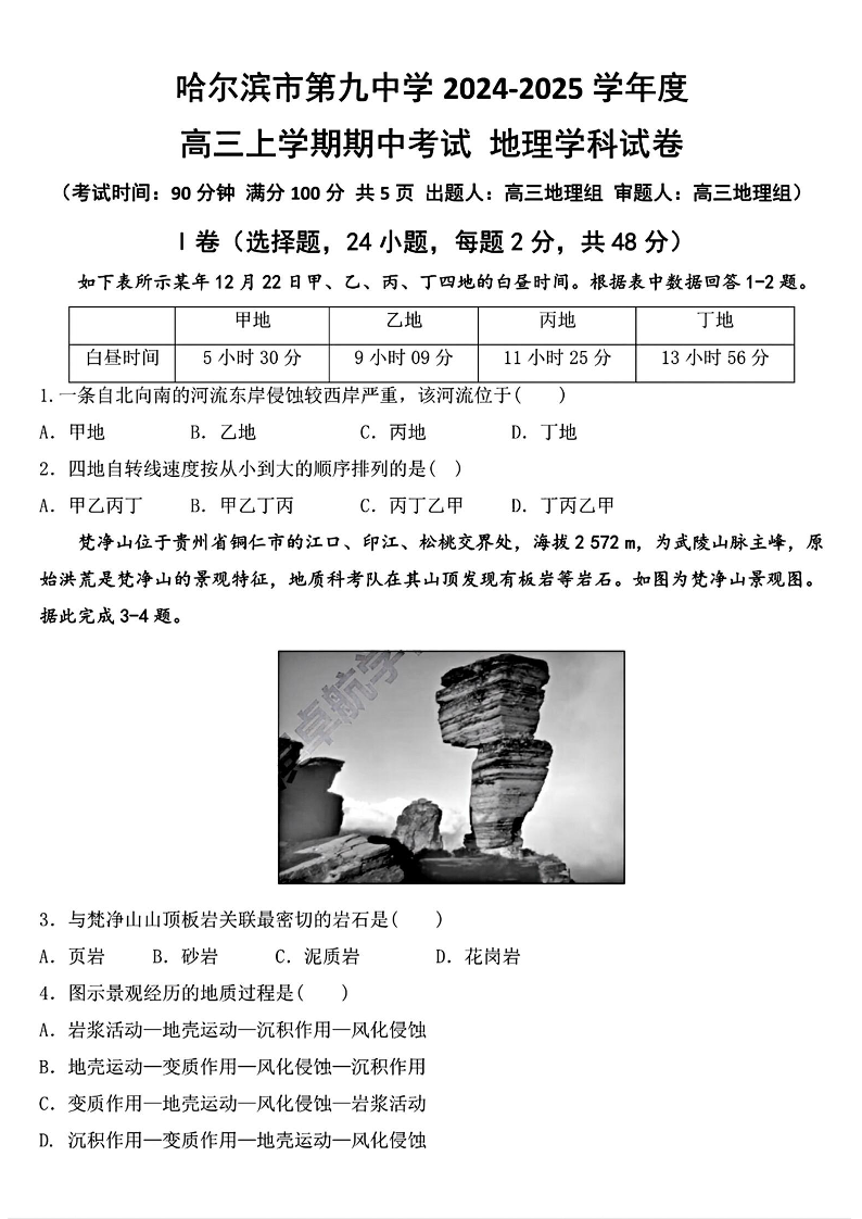 黑龙江省哈尔滨市第九中学2025届高三上学期期中考试地理+答案