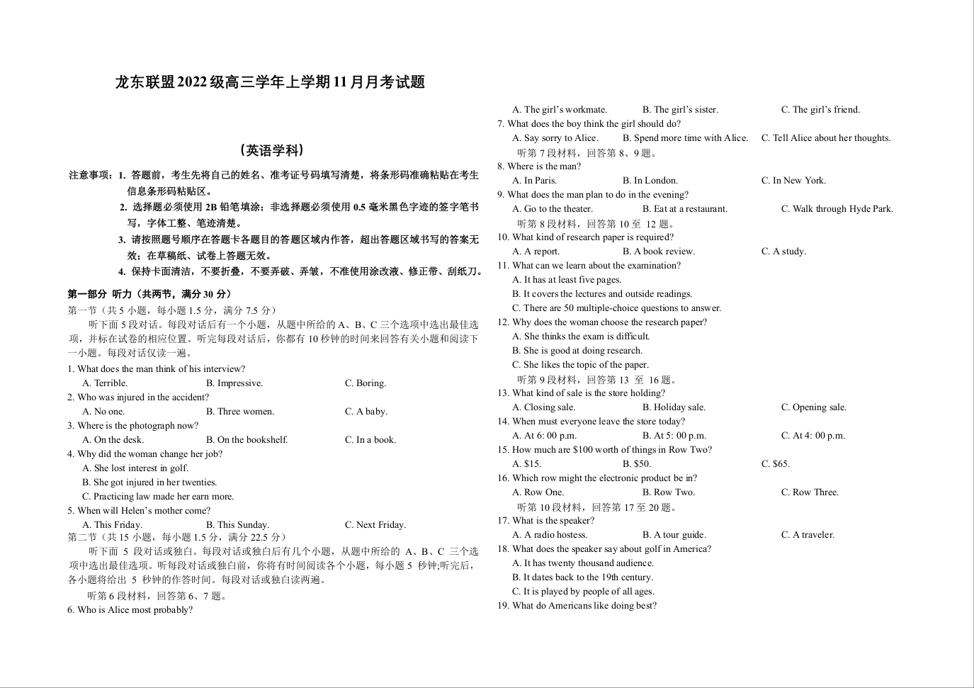 黑龙江省龙东联盟2025届高三上学期11月月考英语
