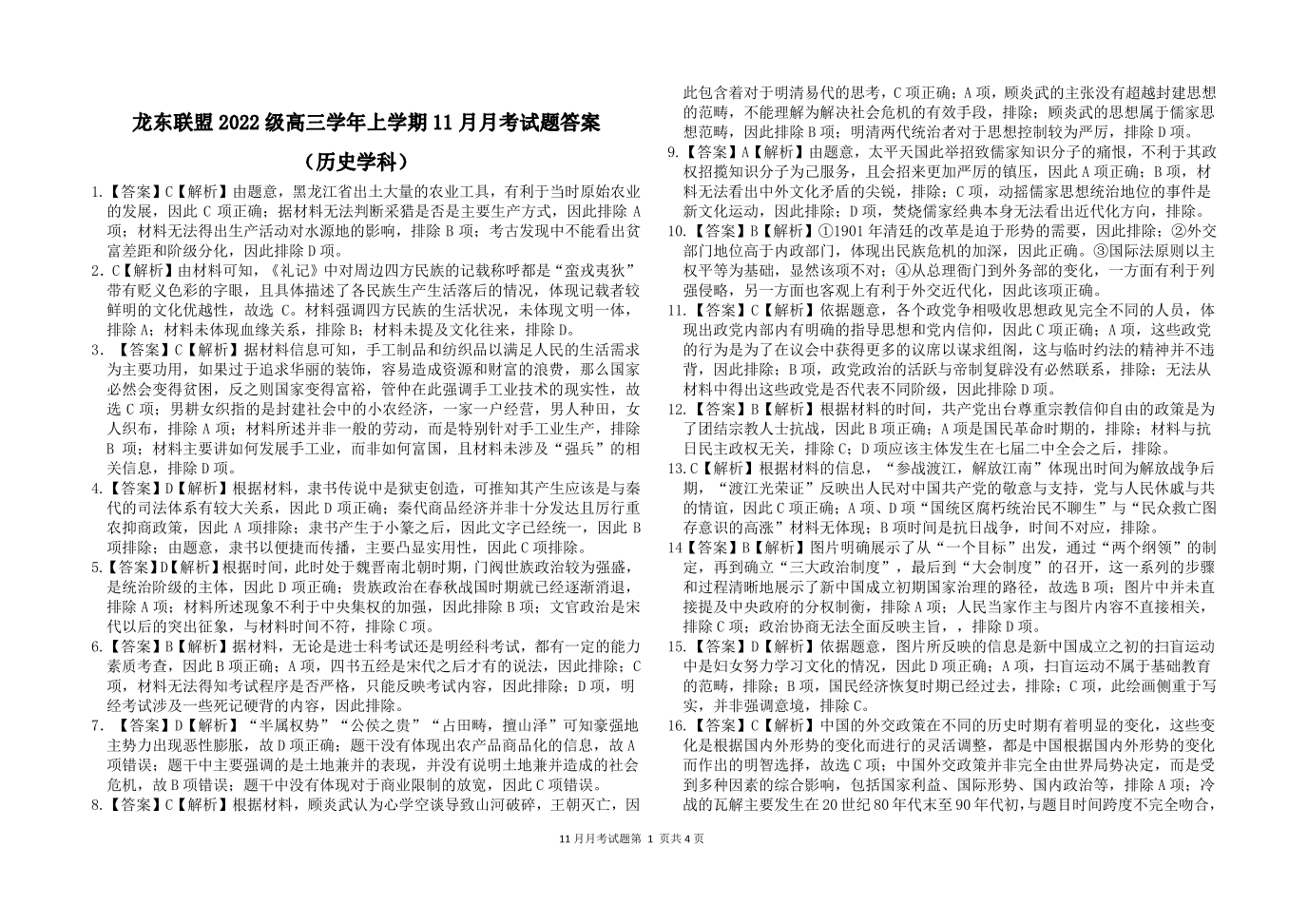 黑龙江省龙东联盟2025届高三上学期11月月考历史答案