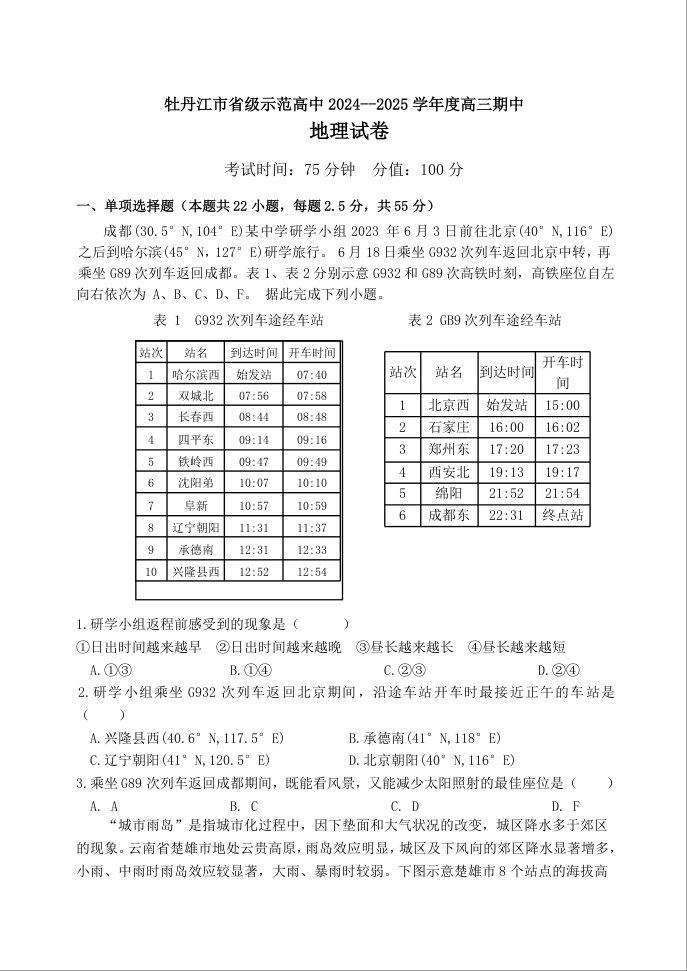 黑龙江省牡丹江市省级示范高中2025届高三上学期期中考试地理答案