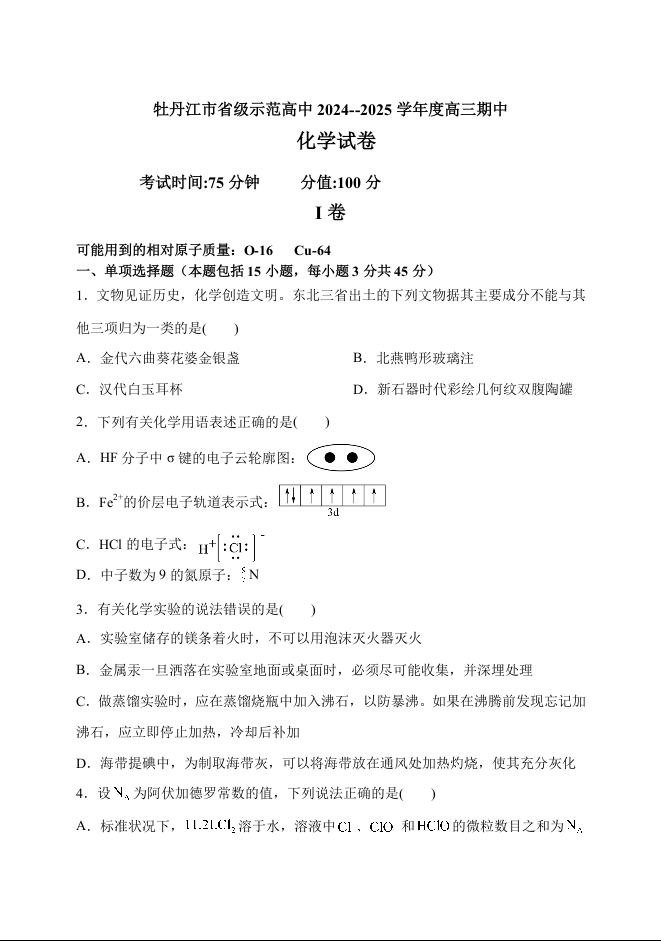 黑龙江省牡丹江市省级示范高中2025届高三上学期期中考试化学+答案