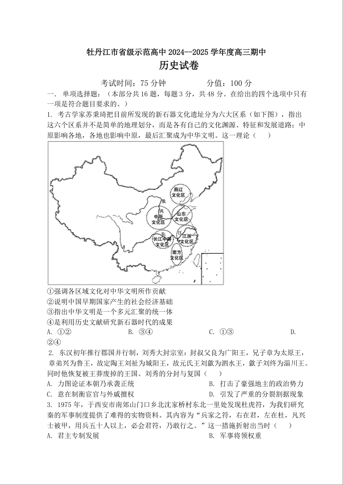 黑龙江省牡丹江市省级示范高中2025届高三上学期期中考试历史+答案