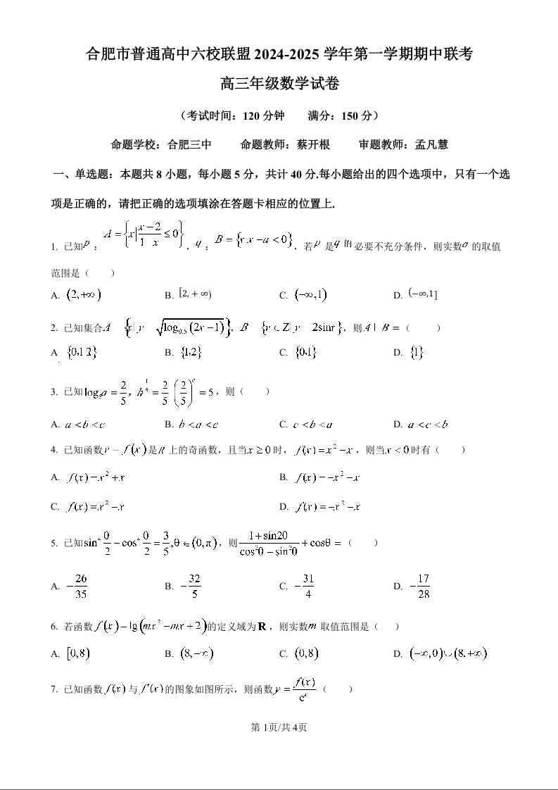安徽省合肥市普通高中六校联盟2025届高三上学期11月期中联考数学(原卷版)