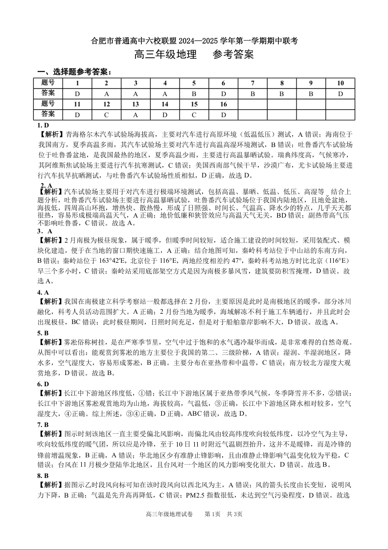 安徽省合肥市普通高中六校联盟2025届高三上学期11月期中联考地理答案