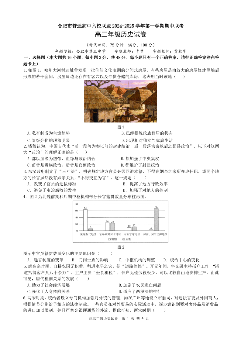 安徽省合肥市普通高中六校联盟2025届高三上学期11月期中联考历史