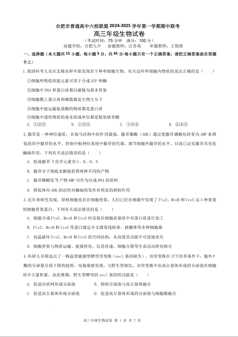 安徽省合肥市普通高中六校联盟2025届高三上学期11月期中联考生物