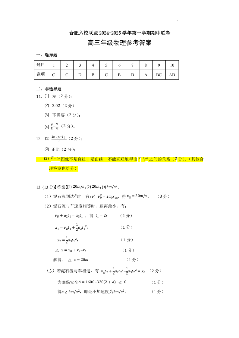 安徽省合肥市普通高中六校联盟2025届高三上学期11月期中联考物理答案