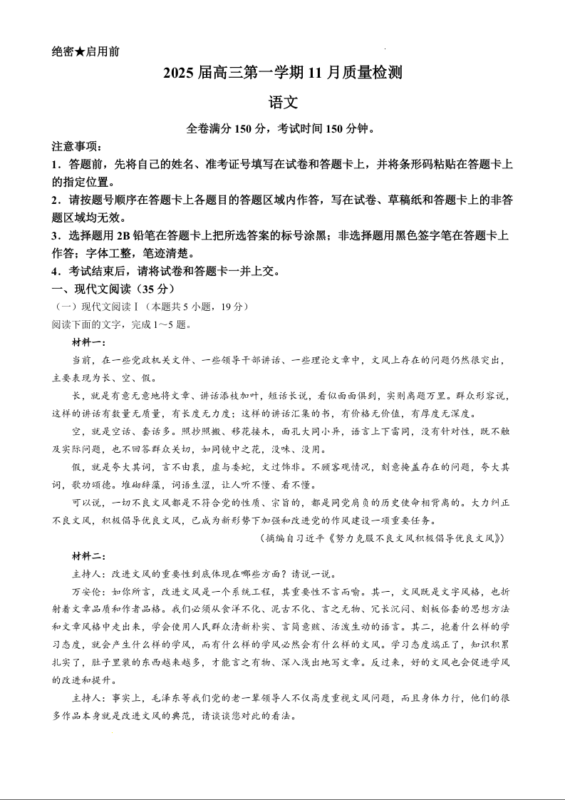 河南省部分示范性高中2025届高三上学期11月期中质量检测语文+答案
