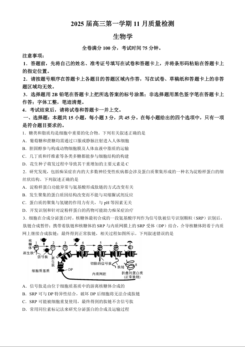 河南省部分示范性高中2025届高三上学期11月期中质量检测生物+答案