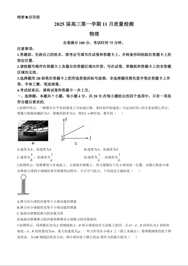 河南省部分示范性高中2025届高三上学期11月期中质量检测物理+答案