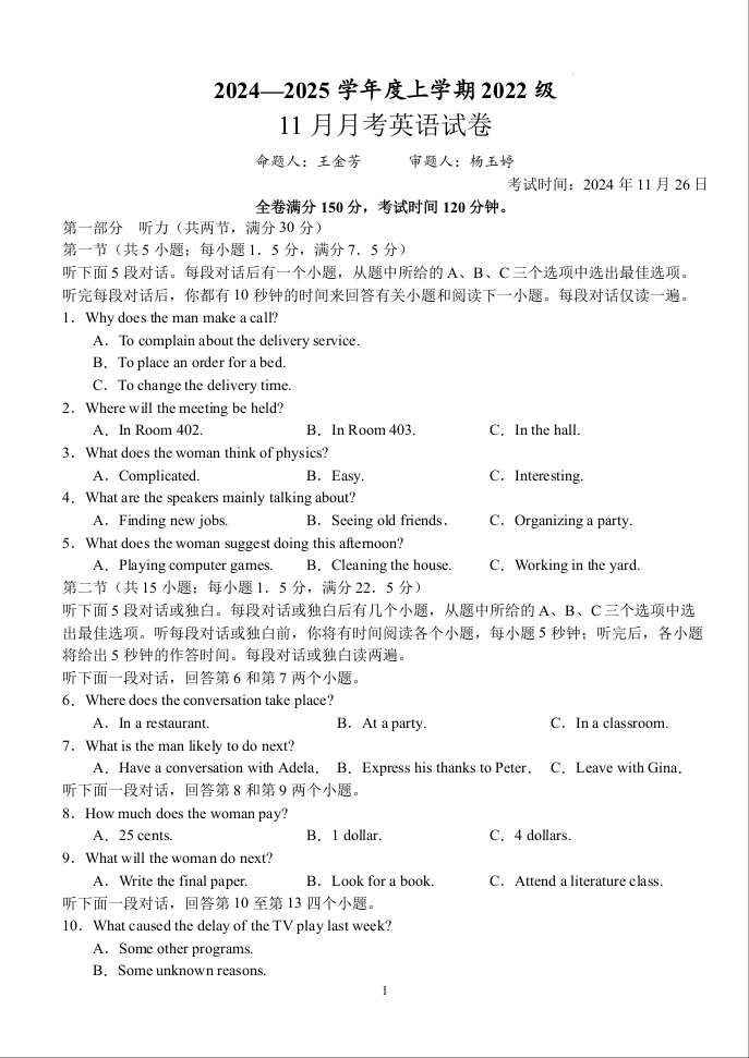 湖北省荆州沙市中学2025届高三上学期11月月考英语+答案