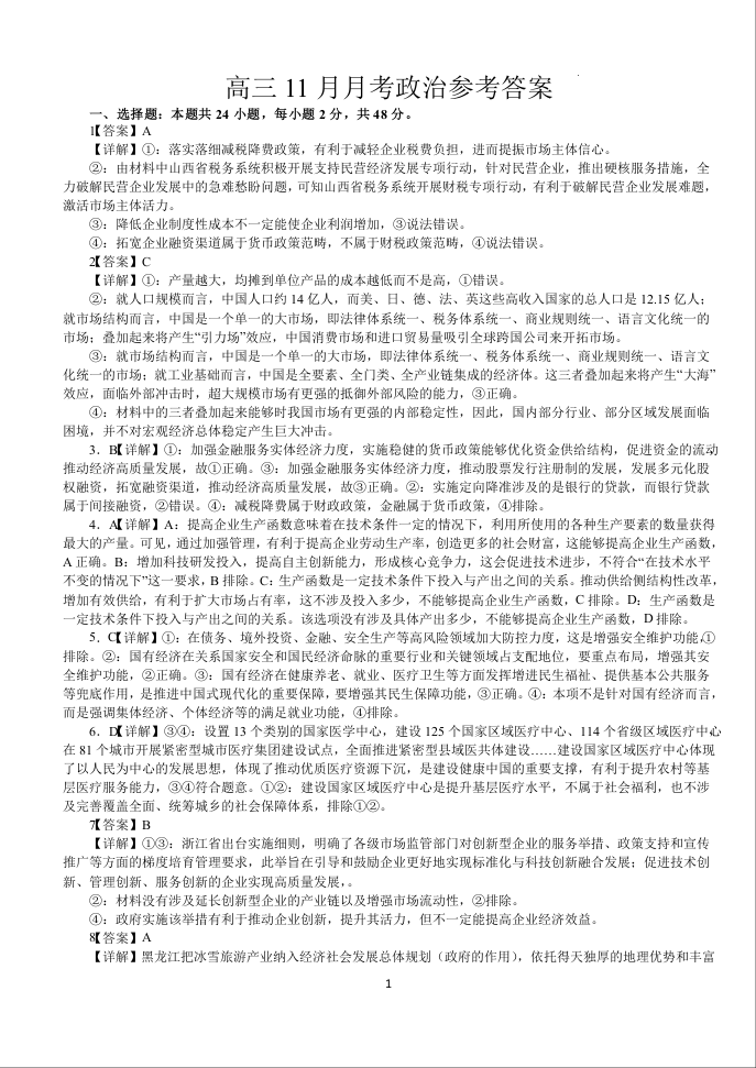 湖北省荆州沙市中学2025届高三上学期11月月考答案