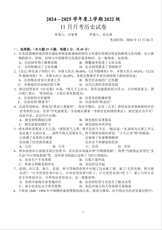 湖北省荆州沙市中学2025届高三上学期11月月考历史+答案