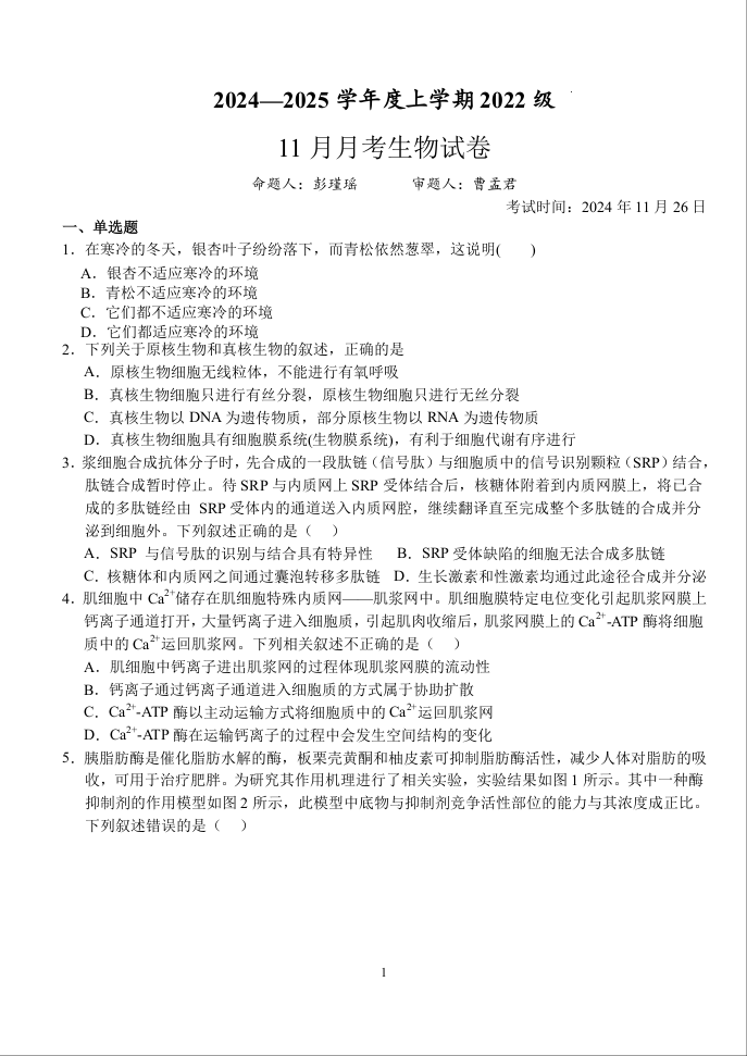 湖北省荆州沙市中学2025届高三上学期11月月考生物+答案