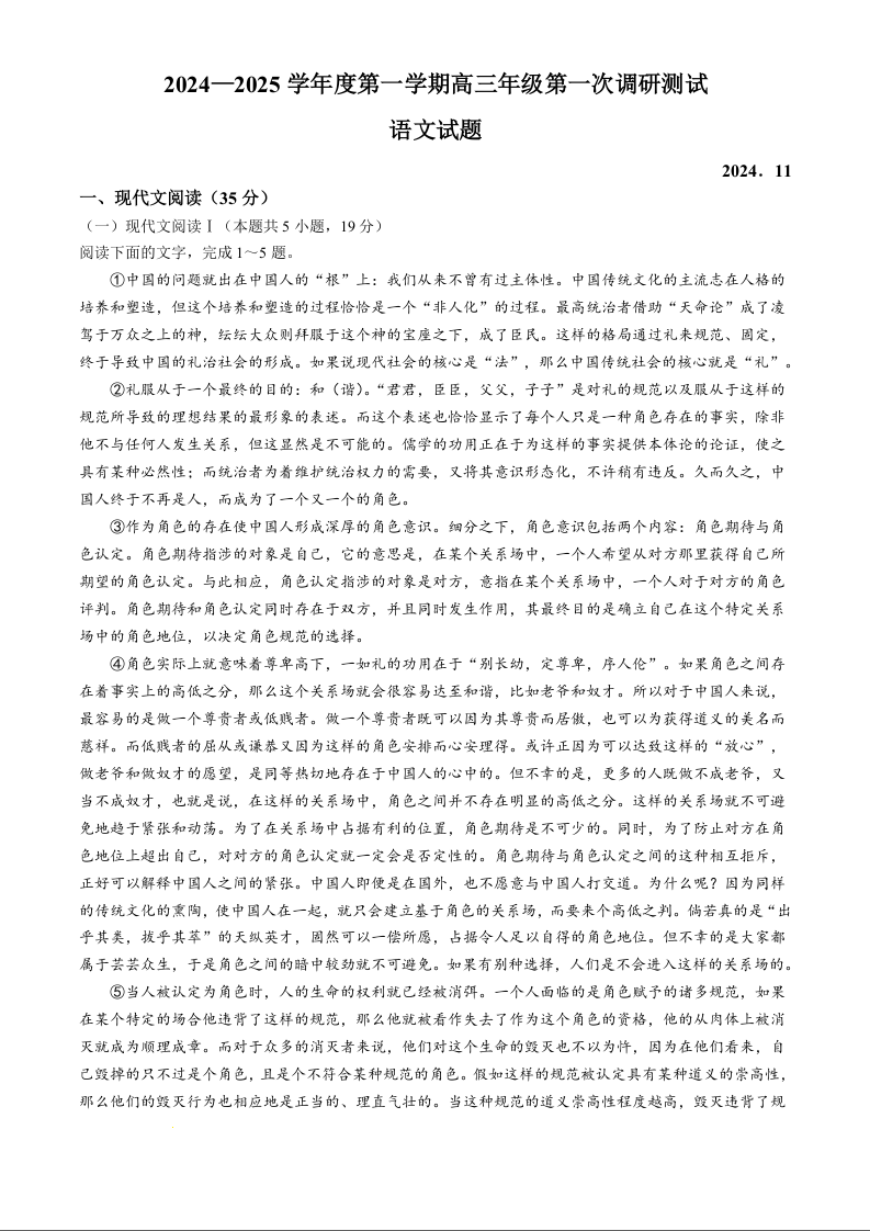 江苏省淮安市2025届高三上学期第一次调研测试语文+答案