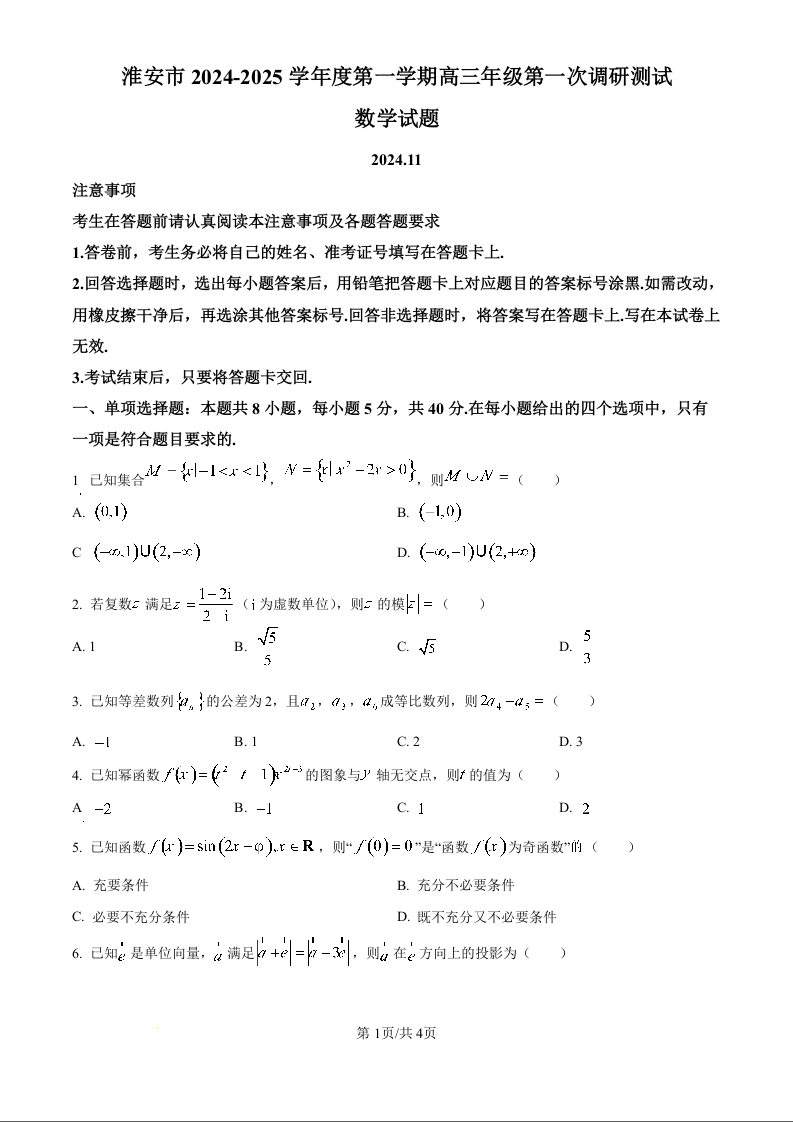 江苏省淮安市2025届高三上学期第一次调研测试数学(原卷版)