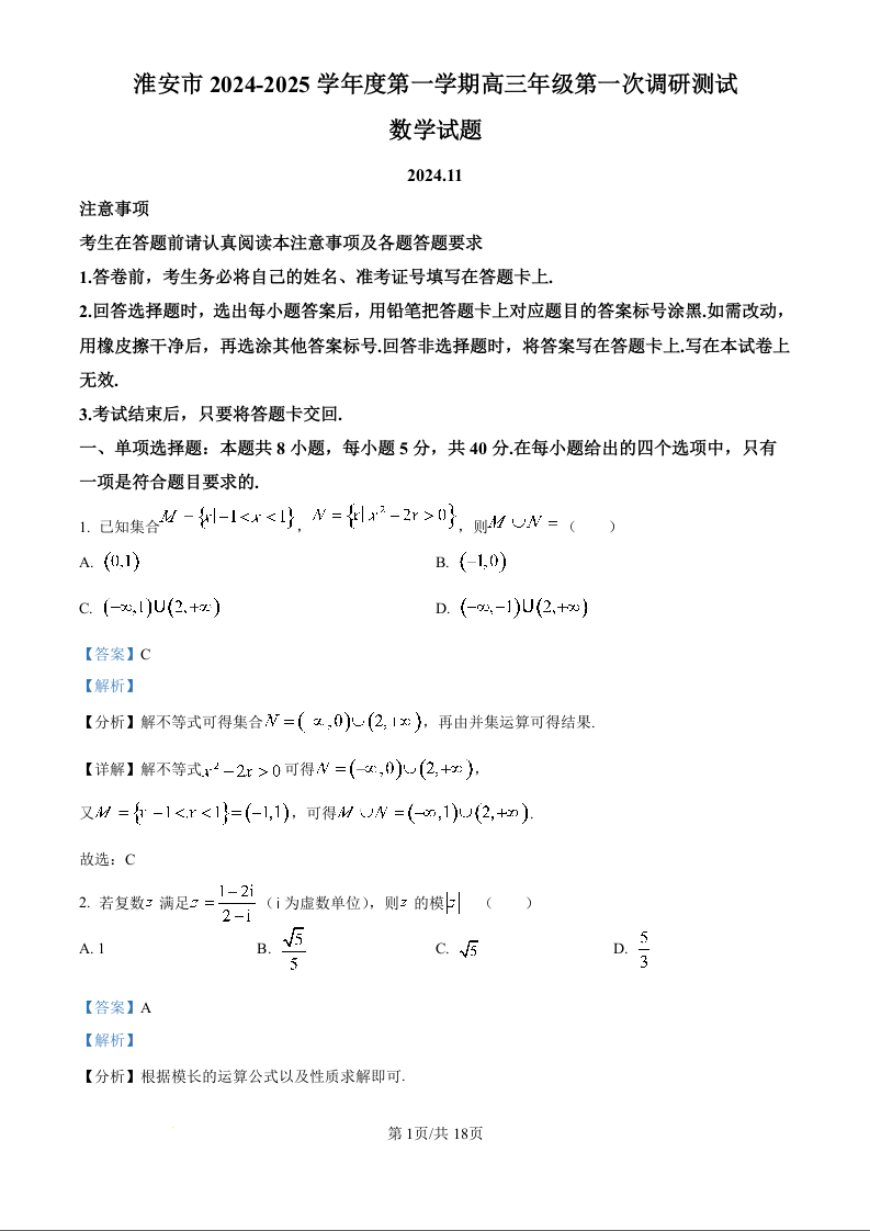 江苏省淮安市2025届高三上学期第一次调研测试数学(精品解析版)