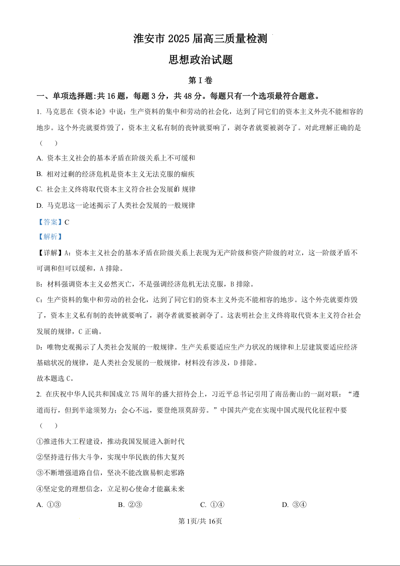 江苏省淮安市2025届高三上学期第一次调研测试政治(精品解析版)