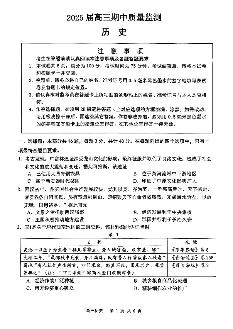 江苏省南通市通州区、如东县2025届高三上学期11月期中联考历史+答案