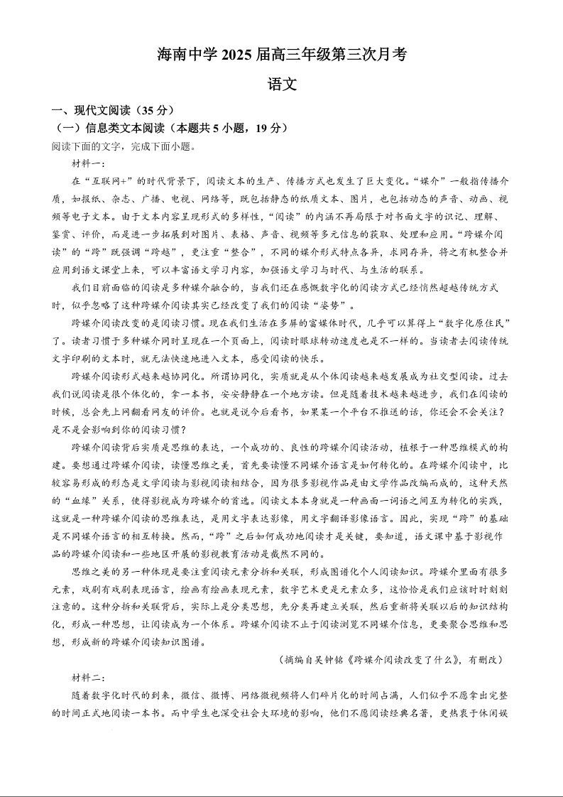 海南省海口市海南中学2025届高三上学期第三次月考语文