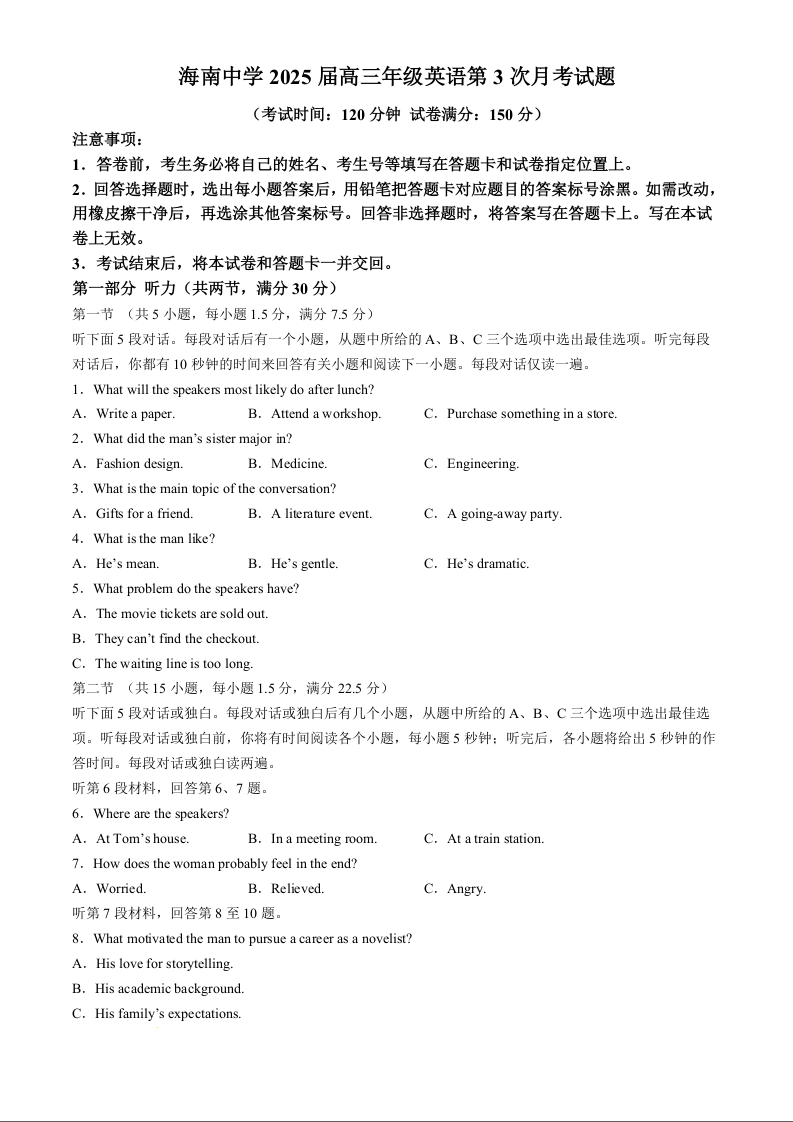 海南省海口市海南中学2025届高三上学期第三次月考英语+答案