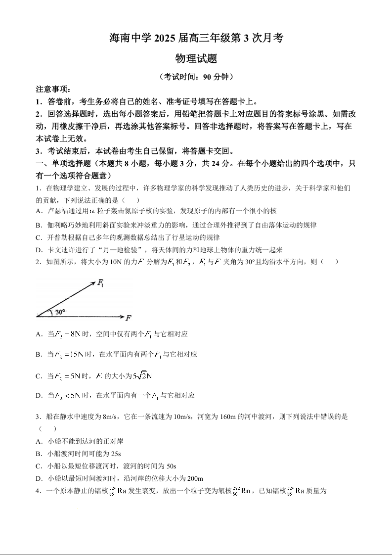 海南省海口市海南中学2025届高三上学期第三次月考物理