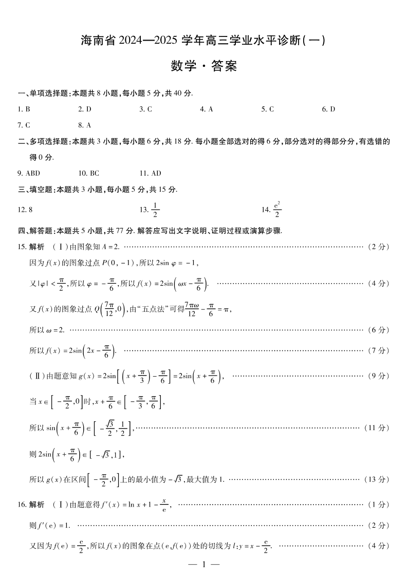 海南省2024-2025学年高三上学期学业水平诊断(一)数学答案
