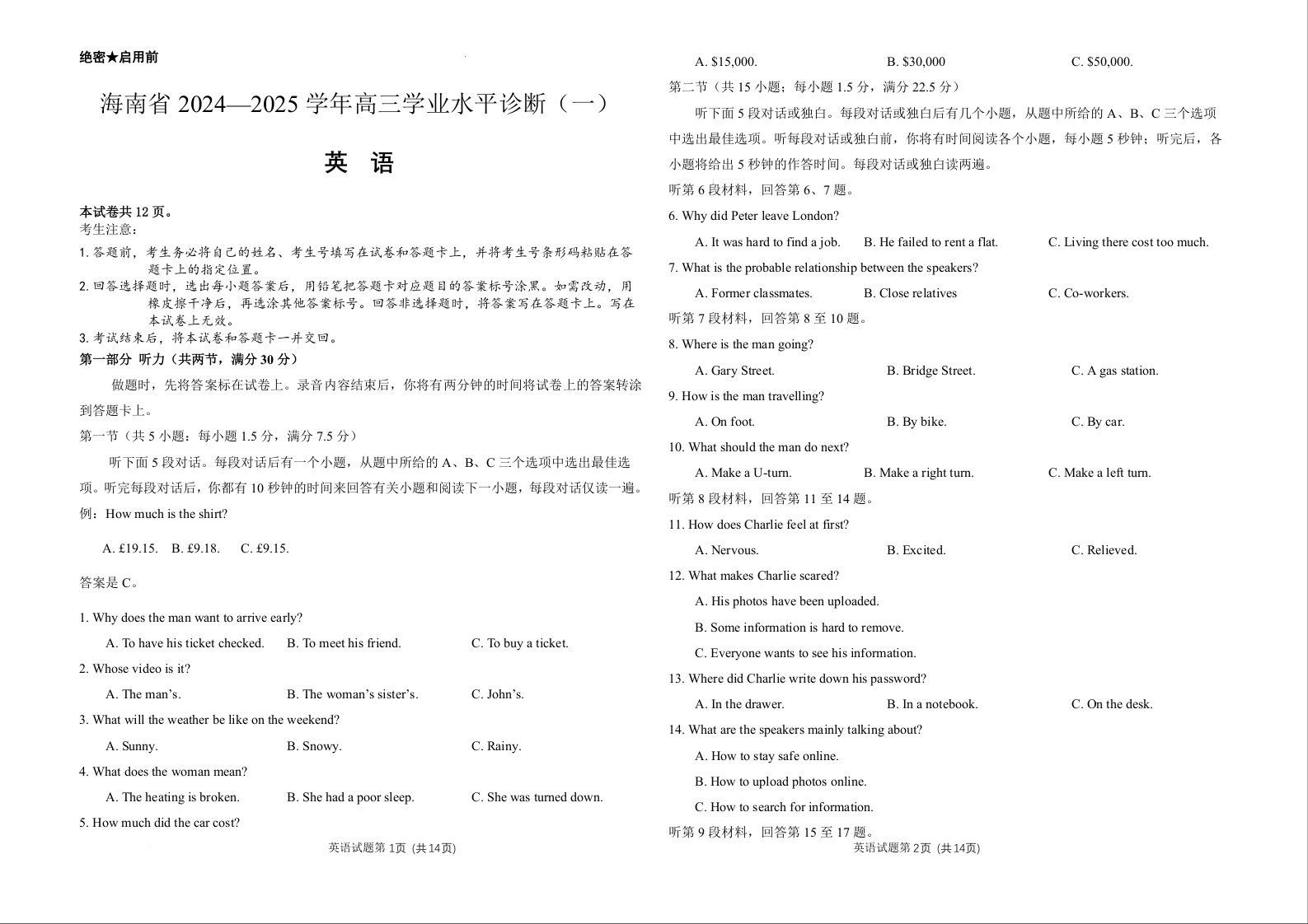 海南省2024-2025学年高三上学期学业水平诊断(一)英语