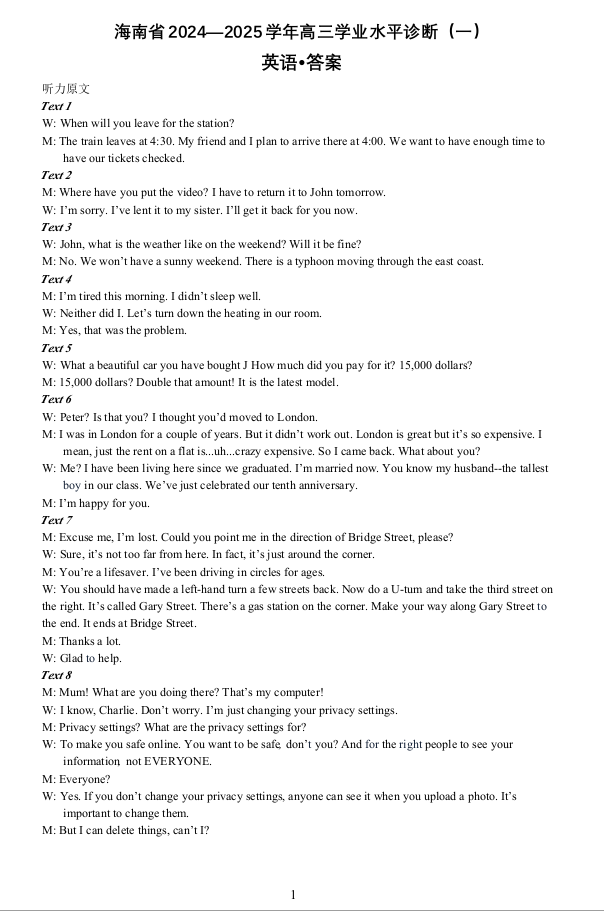 海南省2024-2025学年高三上学期学业水平诊断(一)英语答案