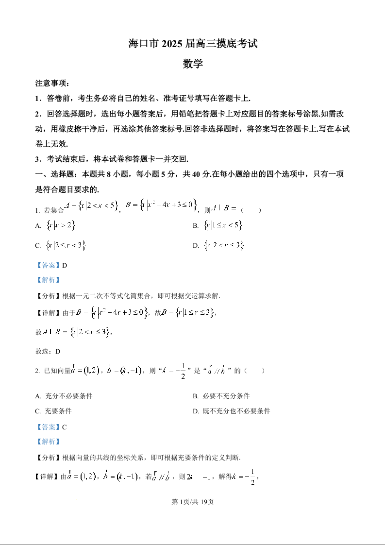 海南省海口市2025届高三上学期10月摸底考试数学(精品解析版)